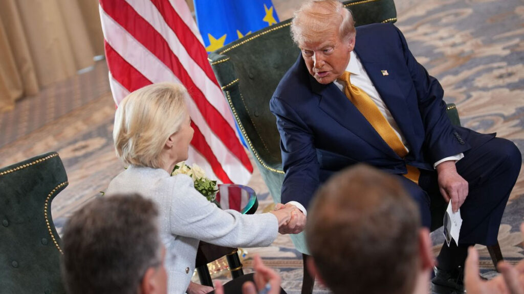 <p>Von der Leyen praised Mr. Trump, calling it a &#8220;good deal&#8221; and a &#8220;huge deal&#8221; that followed &#8220;tough negotiations.&#8221;</p>